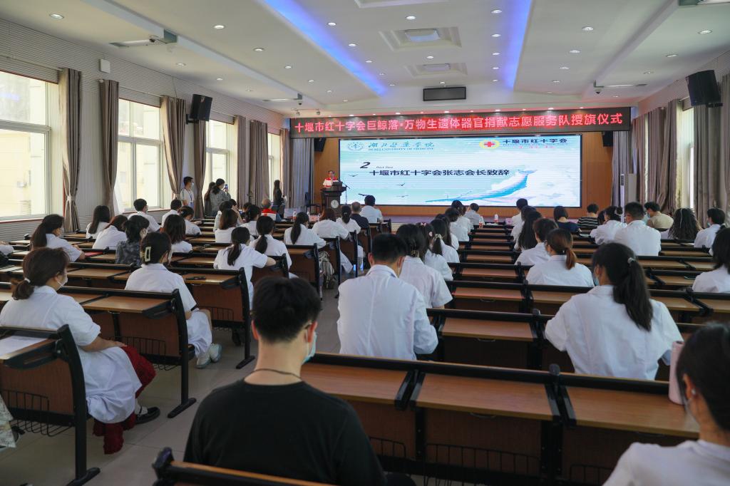 本网讯(通讯员 边晓璐)5月7日下午3点,为促进广大师生对遗体捐献有深入地了解,弘扬“人道、博爱、奉献”的红十字精神,十堰市红十字会巨鲸落·万物生遗体及器官捐献志愿服务队授旗仪式在太阳集团官网8722六楼会议室举行。出席会议的嘉宾有十堰市红十字会常务副会长张志、十堰市红十字会庹丽,十堰市红十字志愿服务总队队长胡利民,太阳网集团tyc8722党委副书记、校长李和,党委学工部部长、校团委书记陈璞,太阳集团官网8722院长唐俊明,太阳集团官网8722分党委书记张秋芳,太阳集团官网8722副院长李健,太阳集团官网8722第六党支部书记姚柏春,遗体捐献接受站的相关老师,志愿服务队志愿者约150人参会。