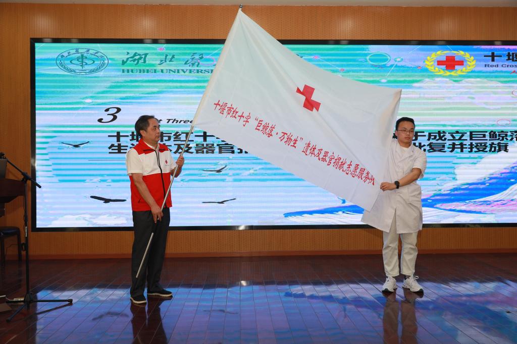 张志致辞。他说,无私奉献的红十字志愿者将工作走在社会前列,传播“人道、博爱、奉献”的红十字精神获得全社会的肯定。希望红十字精神融入日常生活,希望红十字志愿者增强志愿工作认同感、使命感积极投身到遗体及器官捐献宣传志愿活动,为拯救更多生命做出新的贡献。张志解读了关于成立十堰市红十字会巨鲸落·万物生遗体及器官捐献志愿服务队的批复并授旗。