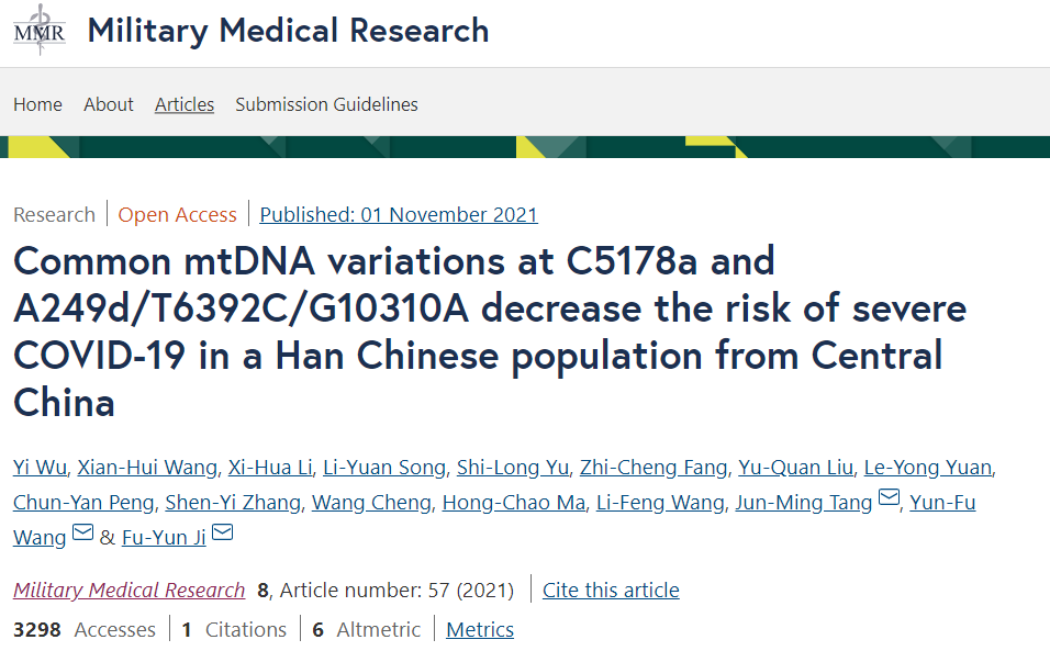 本网讯(通讯员 伍一 李锡花)太阳网集团tyc8722戢福云团队在《Military Medical Research》上,发表题为“CommonmtDNA variations at C5178a and A249d/T6392C/G10310A decrease the risk of severeCOVID‑19 in a Han Chinese population from Central China”的研究论文。该期刊2021年影响因子为34.915。太阳网集团tyc8722戢福云教授、王云甫教授、唐俊明教授为论文的共同通讯作者,太阳网集团tyc87222018级研究生伍一、太阳网集团tyc8722王贤慧实验师、李锡花博士为共同第一作者。