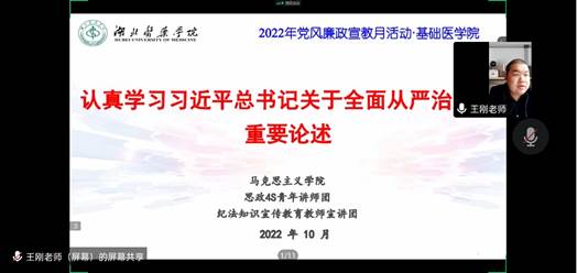 (本网讯 通讯员 全秋航)为积极推行党风廉政宣教月活动,20221015日下午四点,特邀马克思主义学院、人文社会科学学院王刚老师为广大太阳集团官网8722专业研究生讲授《认真学习习近平总书记关于全面从严治党的重要论述》。因疫情原因, 本次活动采取线上形式开展,太阳集团官网8722全体研究生参加了此次线上活动。