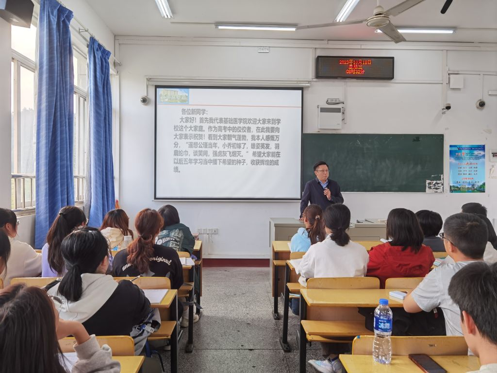 付勇首先介绍了学校的基本概况,引出“如何读大学”让新同学们去思考,然后从临床医学的专业特点、培养目标、培养要求、课程学习等方面进行详细介绍,阐述了临床医学专业学生应具备的知识和能力。他强调培养自主学习的重要性,传授了“七种学习心态”、“七大学习能力”的秘诀。最后,付勇结合自身求学和扶贫工作感悟,将宝贵的个人经验告诉大家,激励同学们为自己理想中的职业生涯而努力奋斗、勤奋学习。