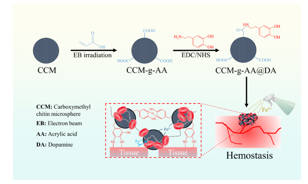 微球作为一种常见的材料形式,具有良好的流动性、适宜的比表面积,在止血材料研究中具有明显优势。但由于止血微球密度小、质轻,面临着被血流冲垮的问题,且单一止血途径往往难以实现有效止血。在本工作中,他们以可降解羧甲基甲壳素微球为基体,利用电子束辐射技术,整合微球、活性羧基/邻苯二酚基团以及铁离子,制备了可吸附、促粘附止血材料CCM-g-AA@DA。在抗凝出血模型中,该微球实现了多途径协同止血作用,明显缩短了出血时间。本研究为控制凝血功能障碍出血的新型微球止血材料的一体化开发制备提供了潜在的思路,也为创面修复及止血相关研究的临床转化提供了重要的技术手段。