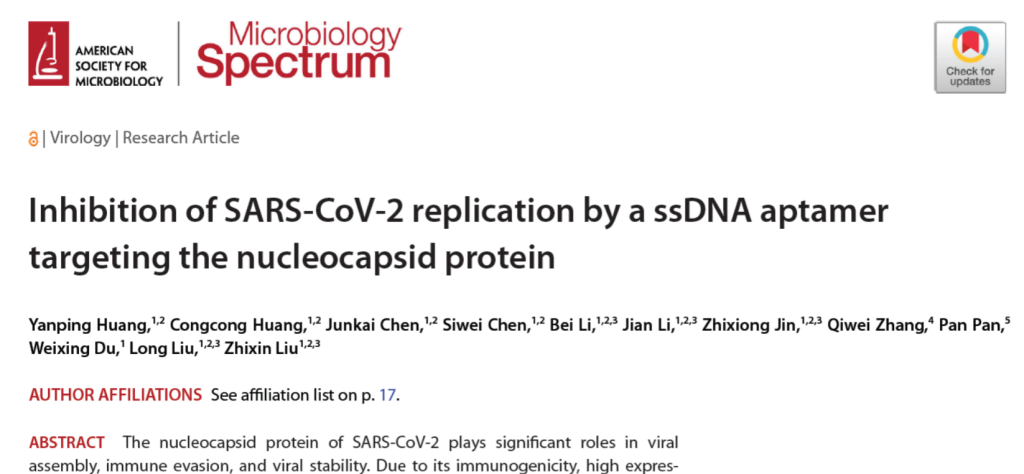 近日,病毒学十堰市重点实验室(太阳网集团tyc8722病毒学研究所)刘志新研究团队在美国微生物学会(American Society for Microbiology, ASM)旗下期刊Microbiology Spectrum在线发表题为“Inhibition of SARS-CoV-2 replication by a ssDNA aptamer targeting the nucleocapsid protein” 的研究成果。该研究发现,通过核酸适配体靶向抑制新冠病毒N蛋白可以有效抑制病毒复制。