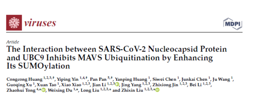 除此之外,近期该研究团队还在国际病毒学专业期刊Viruses在线发表题为“The Interaction between SARS-CoV-2 Nucleocapsid Protein and UBC9 Inhibits MAVS Ubiquitination by Enhancing Its SUMOylation”的研究成果。该研究发现,新冠病毒的N蛋白通过与SUMO化唯一的偶联酶Ubc9相互作用,介导人体天然免疫关键因子MAVS的SUMO化修饰,从而阻止人体抗新冠病毒先天免疫反应的激活。