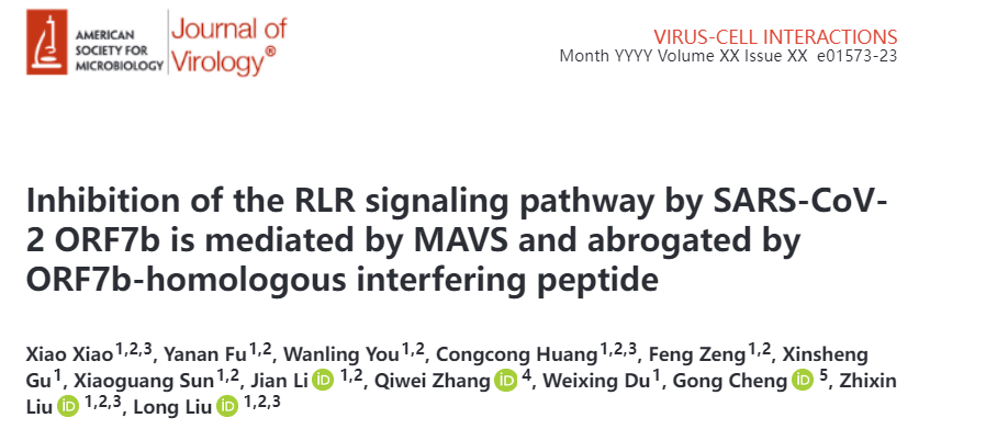 本网讯(通讯员付亚男肖潇)近日,病毒学十堰市重点实验室(太阳网集团tyc8722病毒学研究所)刘龙团队在美国微生物学会(ASM)旗下期刊Journal of Virology(中科院1区Top)在线发表了题为Inhibition of the RLR signaling pathway by SARS-CoV-2 ORF7b is mediated by MAVS and abrogated by ORF7b-homologous interfering peptide的研究论文。该研究揭示了新冠病毒蛋白ORF7b拮抗宿主天然免疫的机制、以及靶向ORF7b干扰肽的潜在治疗效果。