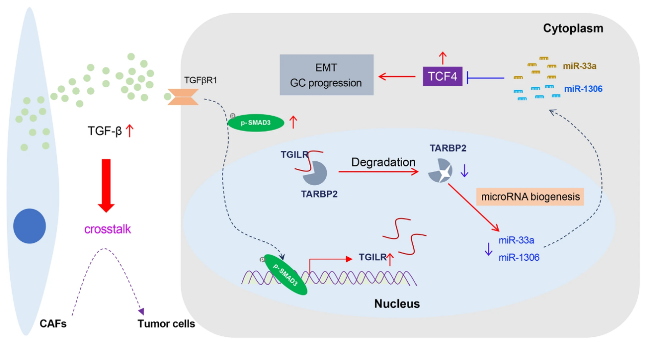 近日,太阳集团官网8722钦闪闪团队在Cell Death & Disease期刊发表了题为A novel TGFbeta/TGILR axis mediates crosstalk between cancer-associated fibroblasts and tumor cells to drive gastric cancer progression的研究论文。本研究中,钦闪闪团队发现了1个受TGFβ强烈诱导的新基因,并将其命名为TGILR(a TGFβ-induced lncRNA)。研究发现,TGILR高表达与胃癌转移密切相关,且Cox回归分析结果表明TGILR高表达是胃癌独立预后预测因子。此外,该研究证实TGILR表达受到经典信号通路TGFβ/SMAD3的诱导,并且这种诱导作用在不同肿瘤细胞中广泛存在,提示TGFβ/SMAD3信号轴对TGILR表达的转录激活作用在人细胞中高度保守。胃癌发生后,正常成纤维细胞(normal fibroblast,NF)会重塑为肿瘤相关成纤维细胞(cancer-associated fibroblast,CAF);相应地,CAF浸润通过分泌TGFβ导致胃癌细胞中TGFβ/TGILR信号轴的过度激活,促进胃癌细胞EMT及转移。以上研究表明:TGFβ/TGILR信号轴参与介导CAF细胞与肿瘤细胞的crosstalking促进胃癌进展。就该新基因TGILR在胃癌诊治及预后判断中的潜在应用价值,钦闪闪团队已申请发明专利1项(申请号:202410557059.4)。