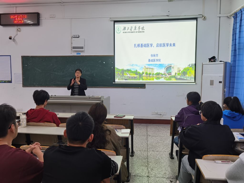 张秋芳首先介绍了学校、学院的基本概况,从学校精神、校训、人才培养特色等方面展开,阐述了基础医学、生物医学科学专业学生应具备的知识和能力。她以马大青、刘超、涂远超等优秀校友事迹激励同学们努力学习、为校争光。最后,张秋芳提出新生未来实现之路:从确立目标、保持学习习惯、保持身心健康等三个方面,勉励同学们积极进取、攻克未来医学难关。