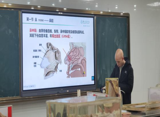 讲授过程中,两位博士将实体解剖标本与多媒体解剖图谱同步展示,将抽象的鼻腔构造具象化,助力学习者精准把握解剖细节。教师试讲结束后,教研室成员围绕教学呈现形式、知识重难点突破等展开研讨。王配军提出优化建议:一方面可强化解剖标本与多媒体课件的联动展示,增强学生对解剖结构的立体认知;另一方面可设计互动式提问,提升课堂参与度,让解剖知识的传递更具实效性。