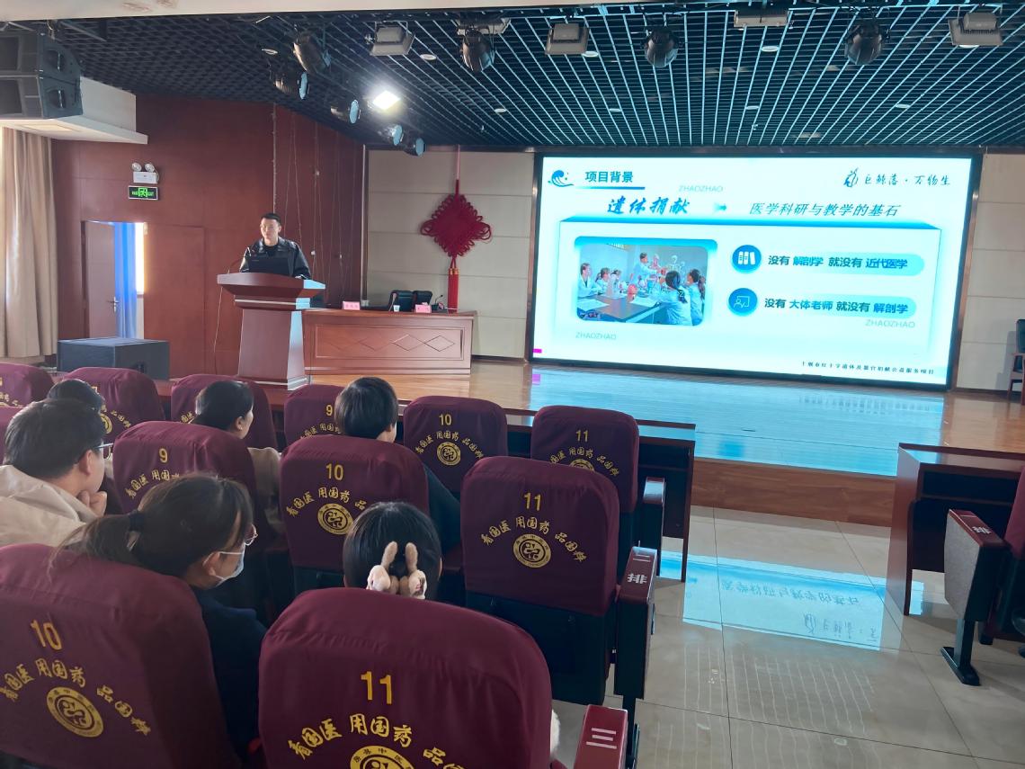 本次讲座的核心环节中,太阳集团官网8722老师、“巨鲸落・万物生” 遗体及器官捐献志愿服务项目指导老师贾贤梁,以《生命如歌,最美鲸落》为题展开分享。作为全国首届红十字志愿服务项目大赛银奖获得者、“十堰好人”,贾贤梁老师结合团队7年公益历程,生动诠释了“巨鲸落,万物生”的深刻内涵——正如巨鲸逝去后滋养深海万物,遗体及器官捐献者以无私奉献为医学教育、科研与临床移植点亮希望。
