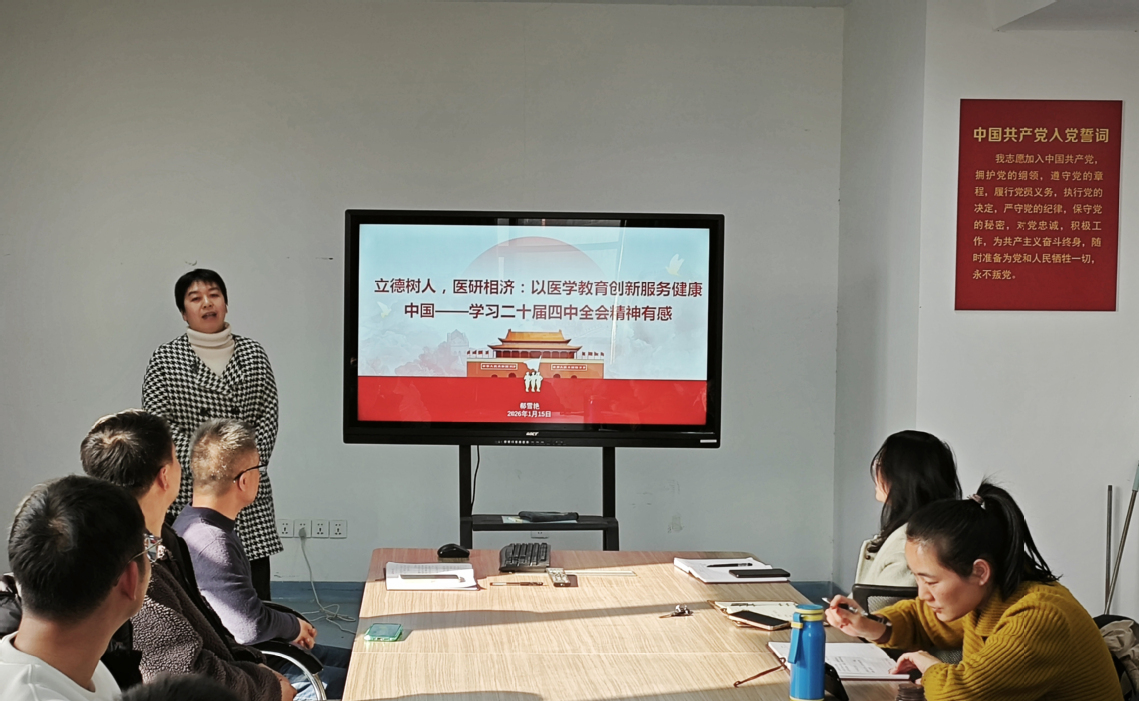 本网讯(通讯员罗旭东)1月15日,太阳集团官网8722第五党支部在科教楼818党员活动室举行主题党日活动。“湖北省师德先进个人”“湖医药学者”郗雪艳教授以《立德树人,医研相济:以医学教育创新服务健康中国——学习党的二十届四中全会精神有感》为题进行宣讲,支部全体教职工参加学习。