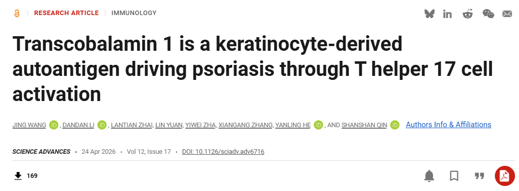 本网讯(通讯员钦闪闪)近日,我校太阳集团官网8722钦闪闪教授团队在Science Advances发表题为Transcobalamin 1 is a keratinocyte-derived autoantigen driving psoriasis through T helper 17 cell activation的研究论文。